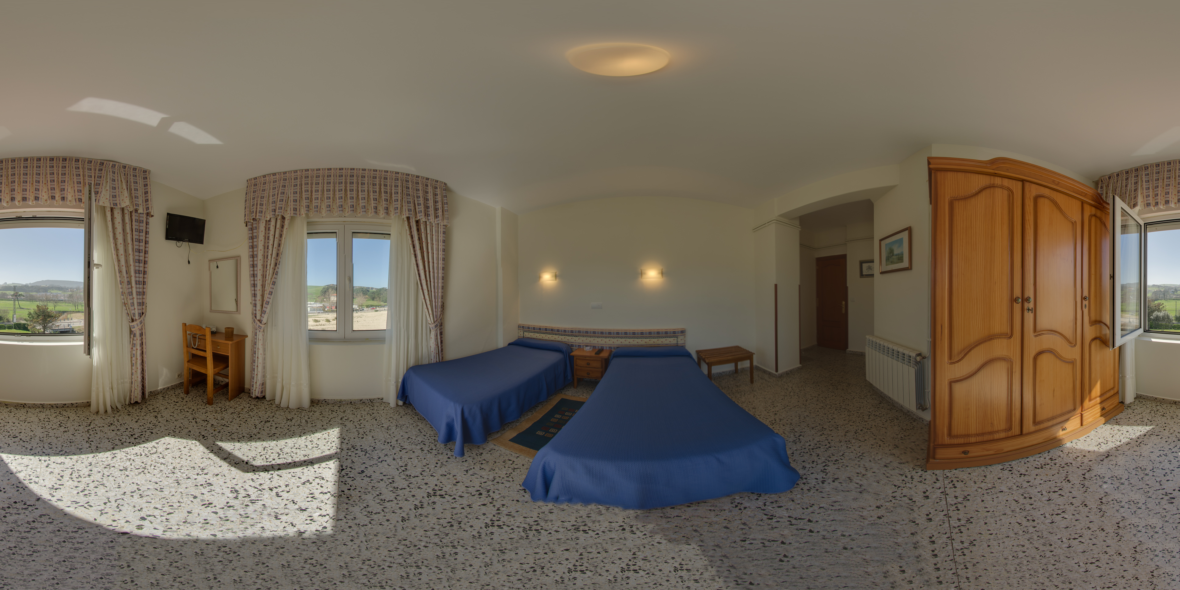 The biggest double room available. Two 105 twin beds. It has views to the garden, the children’s playground and part of the beach.